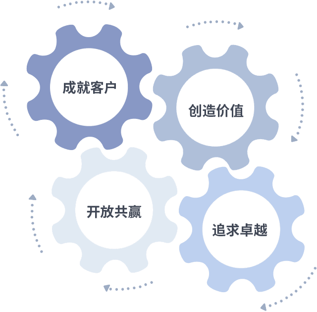成就客户是一切决策的出发点,,,创造价值是衡量所有工作的标准,,追求卓越是我们做事做人的态度,,开放共赢是我们的格局也是最终的结果。。。。价值观的齿轮环环相扣,,推动着组织里的每个人不断向前。。